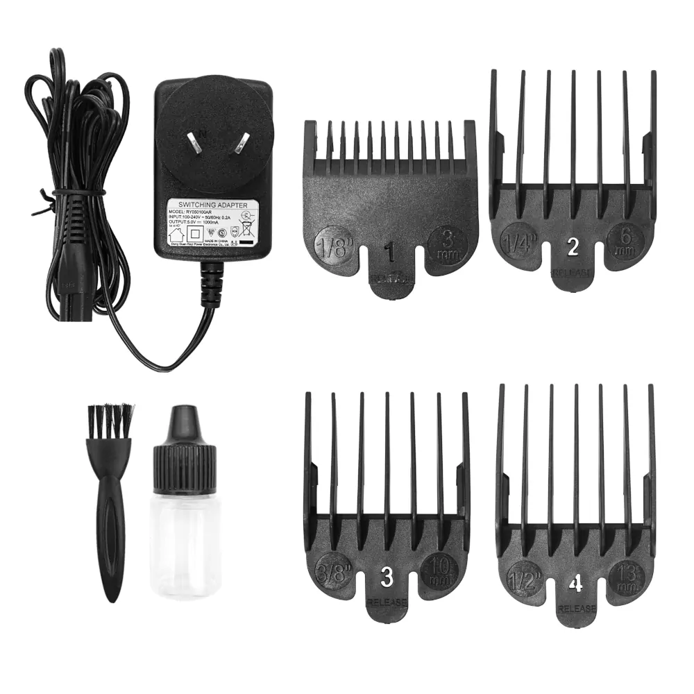 Maquina de corte profesional con 8 Watts de potencia. Motor de voltaje de 3.7V. Material de centrado de latón anti desgaste. Batería de ion litio de 2000 mA. Uso con y sin cable: Motor profesional interno que asegura la potencia de la máquina, garantizando un funcionamiento de alta velocidad y brindando una larga vida útil a la máquina. Cuchilla de más alta calidad de acero y carbón, que brinda mayor eficiencia en el corte del cabello. Cuatro peines de guía para controlar la longitud del cabello